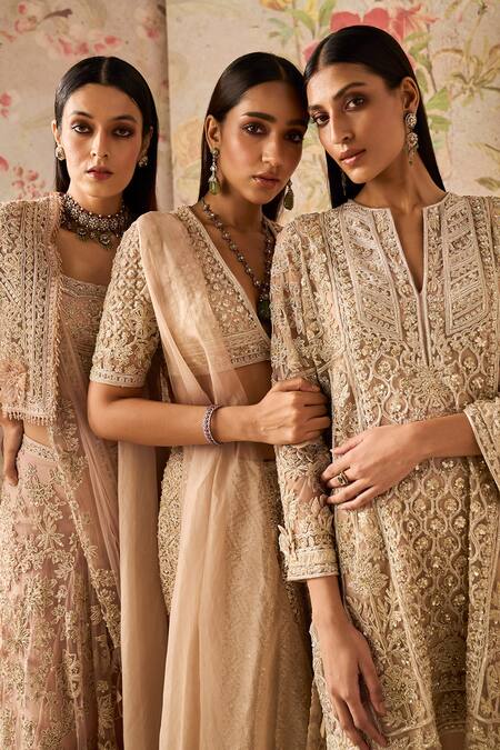 Champagne kurta featuring intricate sequin, bead, thread, and cutdana embroidery in a Mughal pattern. Paired with silk pants for a complete look.
