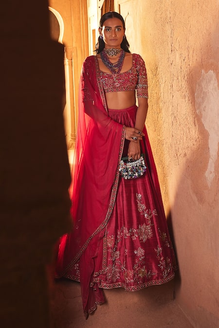 Pink lehenga featuring floral embroidery with cutdana and sequin details. Paired with a scoop neck blouse and an embroidered border dupatta.