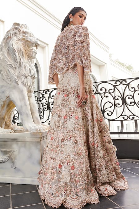 Ivory organza lehenga featuring attached can-can with all over 3D flowers, sequin, cut dana, pearl, bead & thread embroidery. Paired with an embroidered square neck padded blouse and a short jacket with scalloped cut work hem and loop hem details.
