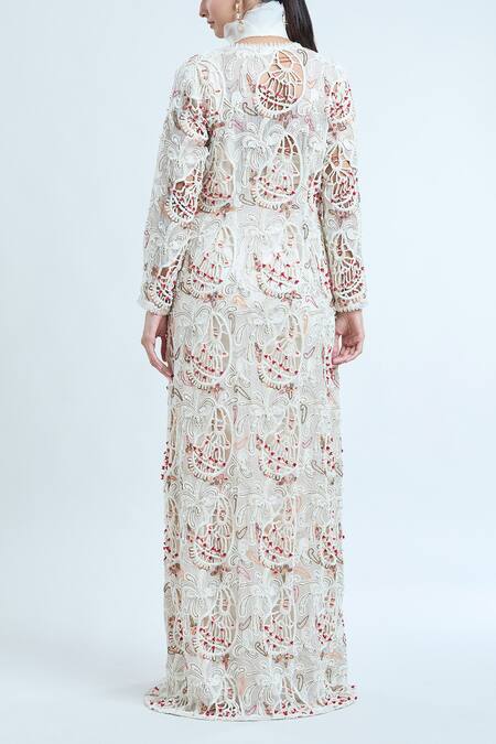 White longline jacket featuring cutwork and beaded embroidery. Accompanied by a solid pre-draped saree and coordinating ruffled halter neck blouse.
