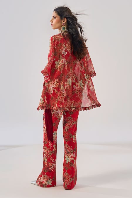 Red coord set featuring a floral chiffon tunic with a flowy design. Paired with a matching bustier and pants, both adorned with floral patterns.