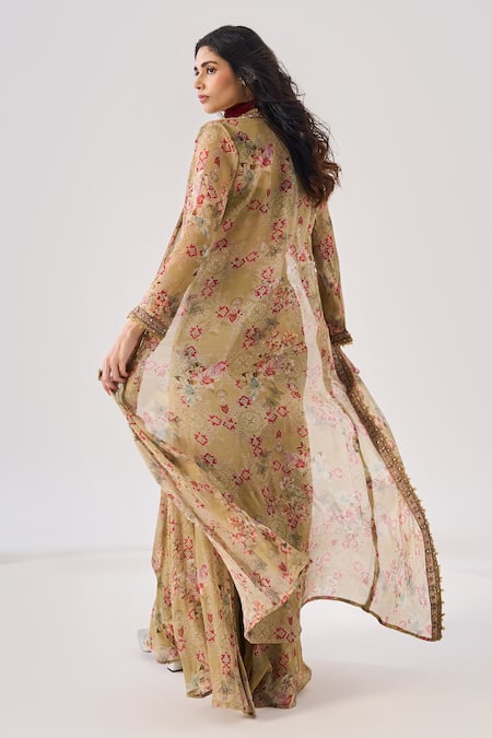 Mint green chiffon jacket featuring floral embroidery. Paired with a sharara and bustier.