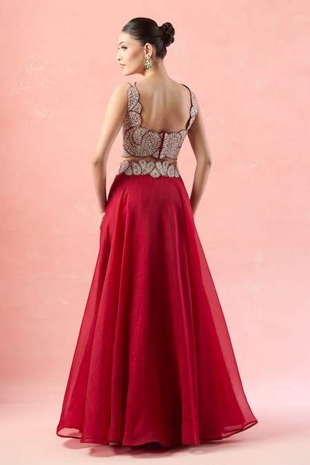 Red Silk, Chiffon Beads, Pearls, Cut Work Scoop Paisley Embroidered Lehenga Set