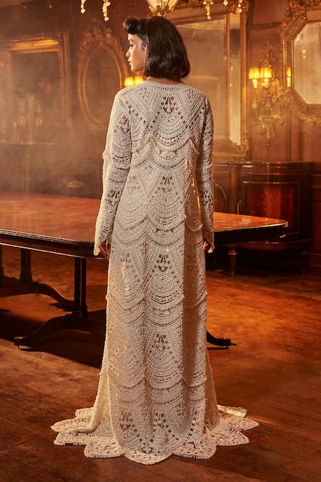 Intricate pearl and sequin embellishments, Scalloped cut work jacket hem, Pearl drop tasselled hem details