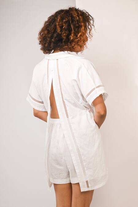 White linen shorts featuring an organza panel box pleat