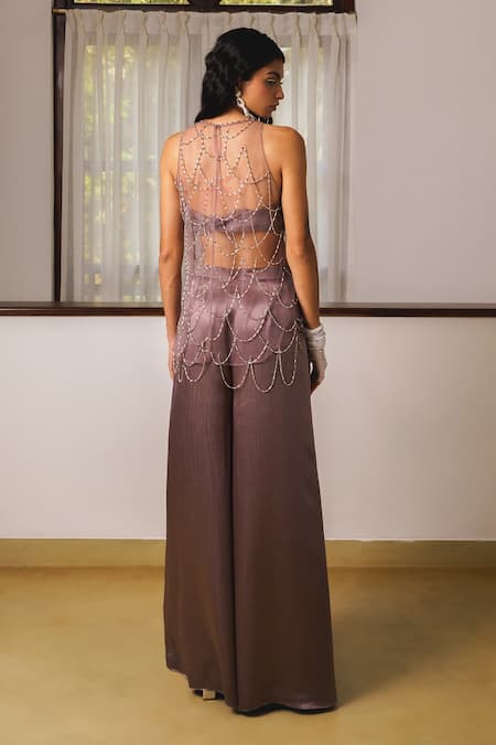 Purple sheer top featuring scallop beads and 3D floral embroidery. Paired with a plain bustier and flared pant.