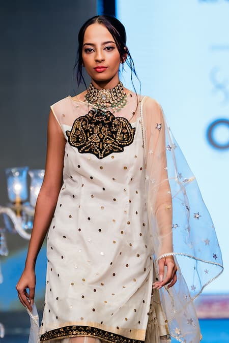 Off white kurta featuring asymmetric neck, sleeveless design, and gold tone paisley patch work. Paired with a sheer lehenga adorned with sequins and an embroidered net dupatta.