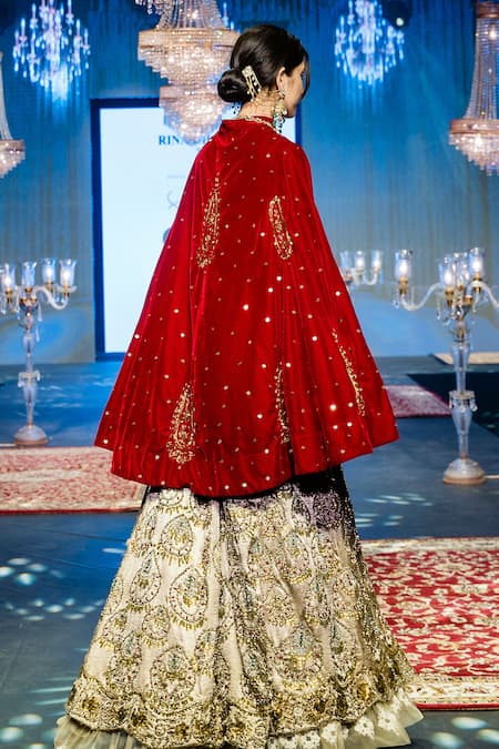 Gold lehenga featuring intricate zardozi and kundan embroidery. Paired with a maroon velvet cape with slit sleeves and a wide V neck blouse with cascading layers of embroidery.