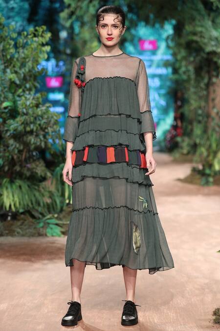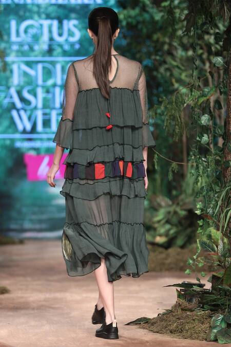 A perfect outfit for a boho chic look in an evening dinner with your friends, this green tier dress with tribal print & sheer sleeves.