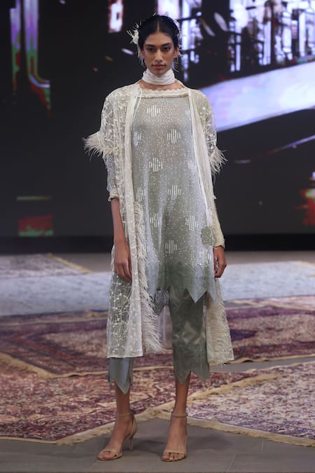 Sea green jacket kurta featuring cutwork neckline, sequin, floral lace embroidery & feather embellishments. Paired with cutwork bordered pant.