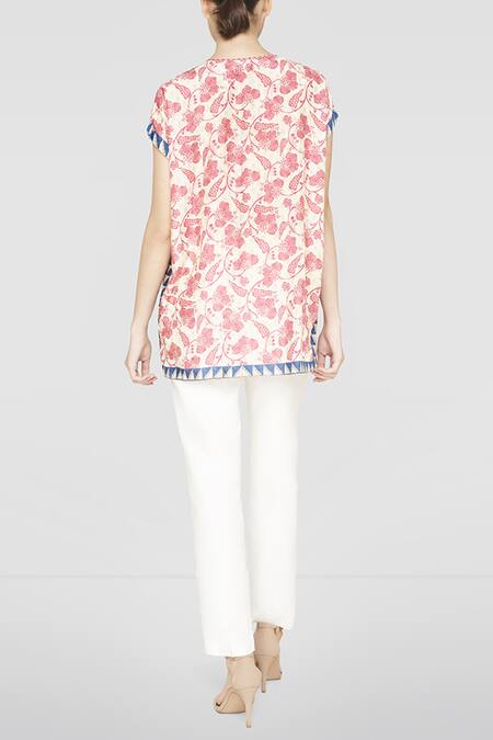 Simple and chic, the beige and pink Rina Top is adorned with printed flowers reminiscent of Rajasthan s forests. It features a youthful blue border and tassel detailing.