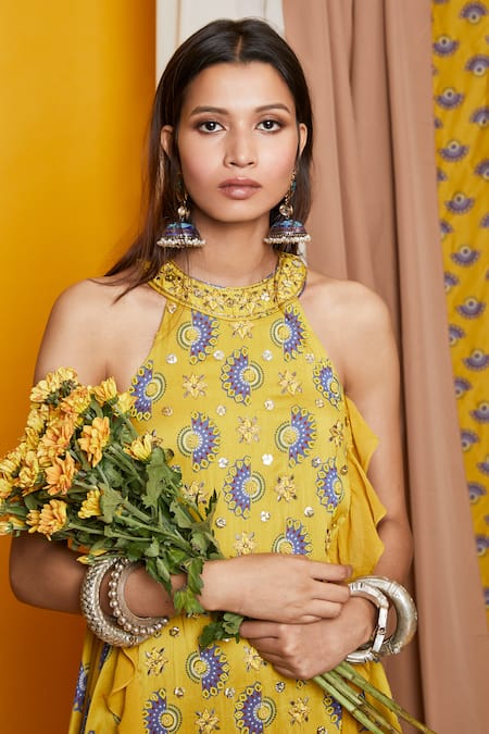 Yellow Monga Silk Halter Chanderi Kurta And Pant Set
