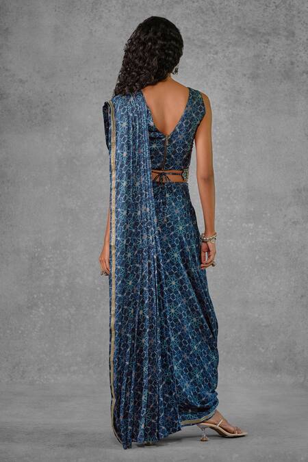 Blue pre-draped saree featuring an all-over floral print with contrast embroidered trim on the border. Paired with a sleeveless embroidered blouse and a belt with all-over embroidery and back tie-up.
