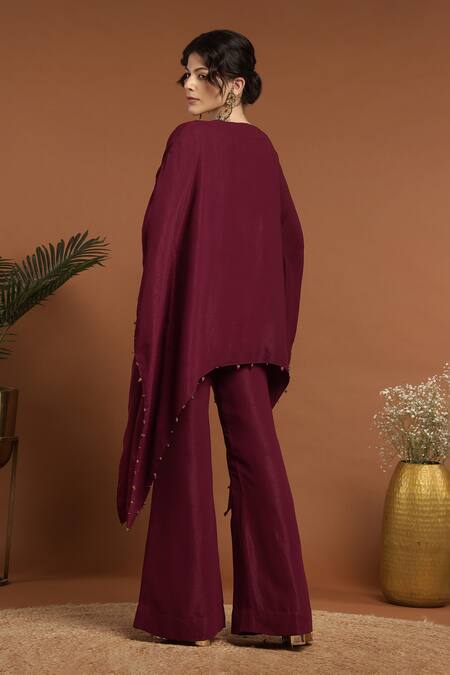 Wine asymmetric kaftan featuring V neckline, sequin and bead embroidery with tassel details. Paired with flared pants for a coordinated look.