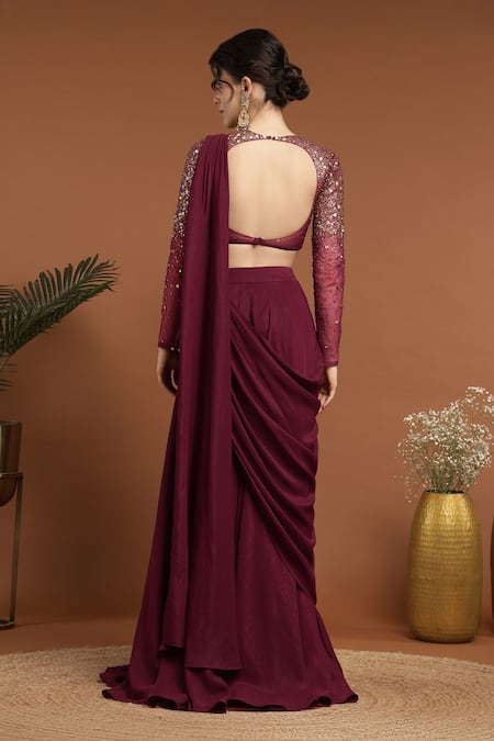 Wine blouse featuring long sleeves, round neck, and celeste sequin-bead embroidery. Paired with a solid pre-draped lehenga saree.