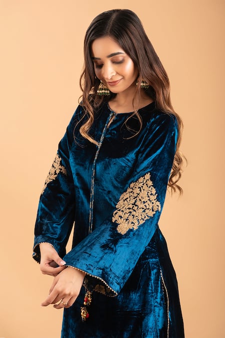 Teal blue velvet kurta featuring flared bell sleeves and crest bloom embroidery. Paired with a bloom jaal woven salwar.