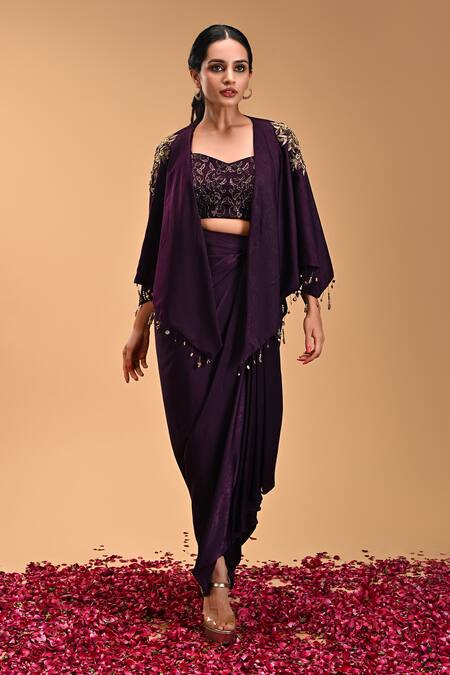 Purple cape featuring kimono sleeves and gold toned petal bloom embroidery. Paired with an embroidered bustier and a draped skirt.