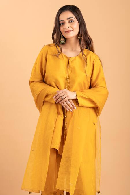 Yellow Silk, Organza Embroidery Round Neck Ghungroo Embellished Kurta Set