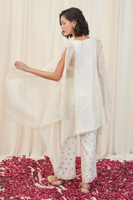 Off white sheer asymmetric textured kurta embellished with sequins. Paired with embellished pant featuring a relaxed fit.