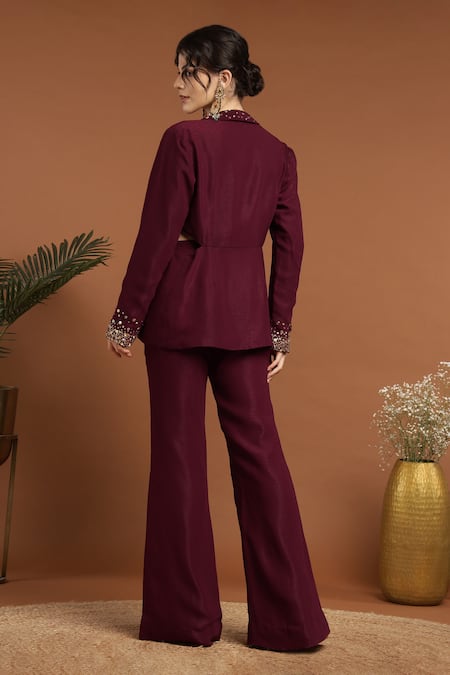 Purple jacket featuring sequin embroidery on the collar and sleeves. Paired with a plain blouse and flared pant.