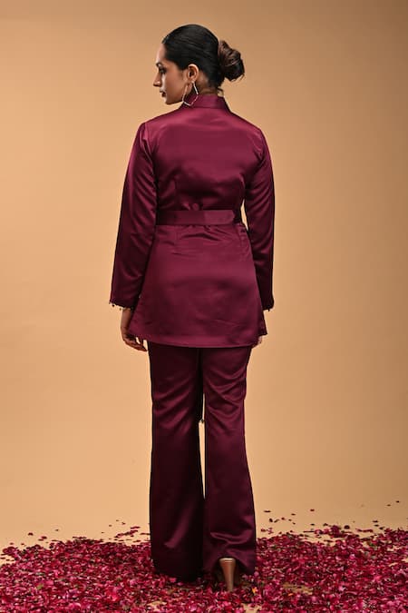 Purple Silk, Satin Embroidery Split V-neck Swastikam Floral Top And Pant Set