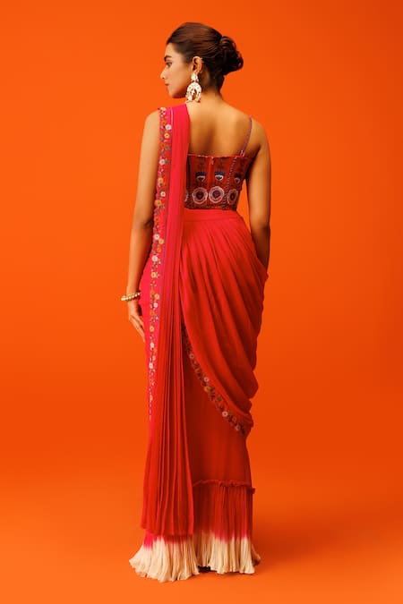 Ivory and pink pre-draped saree made from georgette featuring floral cutwork embroidery. Paired with a padded corset in Bemberg silk.
