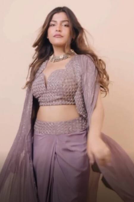 Lilac cape with bead, cutdana embroidery. Paired with bustier blouse & draped skirt.