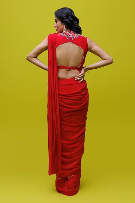 Red Crepe, Organza Embroidery Round Neck Pre-draped Saree With Jacket