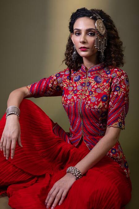 Red peplum top featuring thread embroidery in a floral pattern and a mandarin collar. Paired with pleated gathered pant for a complete look.