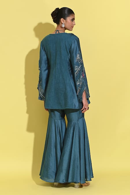 Blue halter neck blouse with fringe and crystal tassel embellishments. Paired with a matching jacket featuring slit bell sleeves and a sharara.