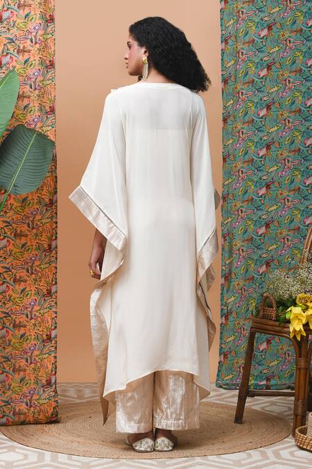Ivory Cotton Lace, Zari V-neck Azra Draped Kaftan Tunic And Pant Set