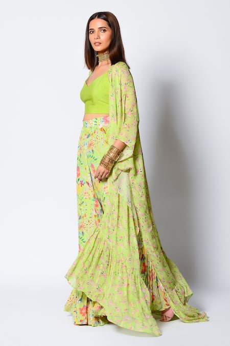 Lime green cape with all-over floral print, ruffle trim and asymmetrical hem. Comes with solid bralette and flared pants.