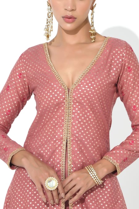 Pink kurta featuring a plunged V neckline, full sleeves, and contrast polka patterns. Paired with a pleated sharara and attached lining.