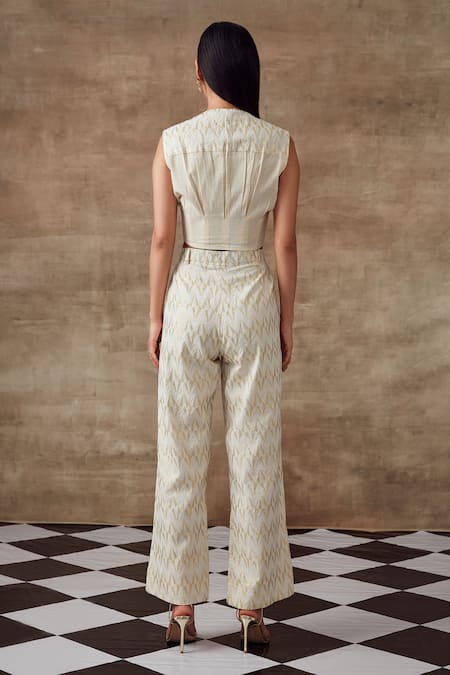 White Organic Cotton Jacquard Geometric Motifs Collared Corset Top And Pant Set