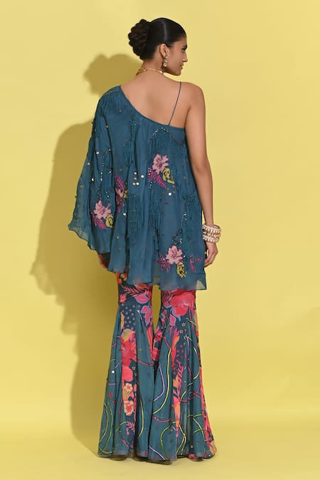 Blue one shoulder cape featuring embellished bloom patchwork and fringes detailing. Paired with a floral print sharara in vibrant multi colors.