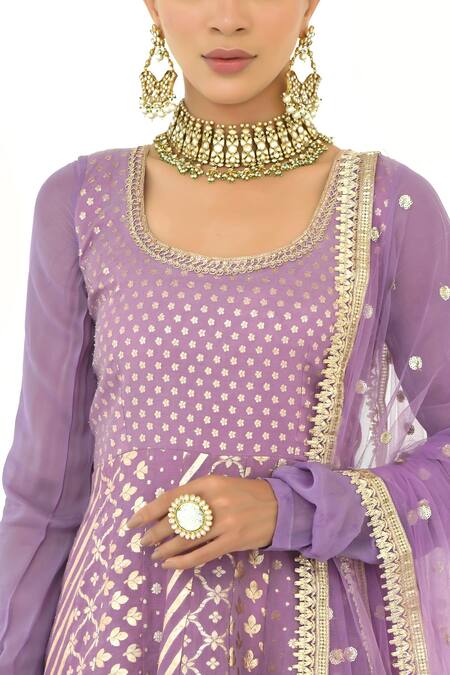 Purple Net, Chanderi, Georgette Embroidery, Floral Pattern Anarkali With Dupatta