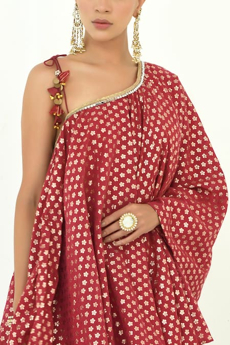 Red flared top featuring asymmetric neckline with contrast floral woven patterns and tasseled strap. Paired with plain pant for a complete set.
