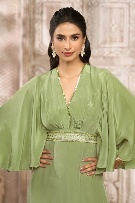 Green Crepe, Georgette Bows, Sequins V-neck Frill Dress With Embellished Belt