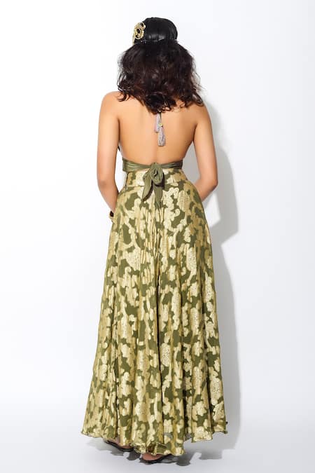 Olive green halter neck bralette with mirror and fringe detail. Comes with foil print ankle length skirt.