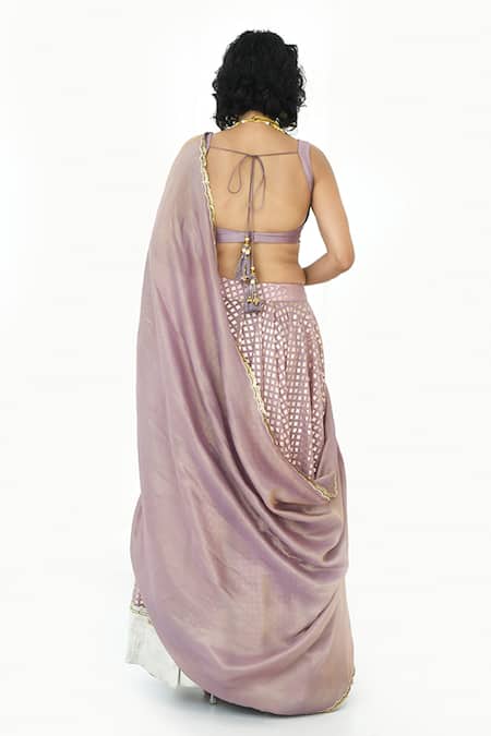 Mauve purple lehenga featuring a geometric pattern with lace detailing at the hem. Paired with a sleeveless blouse adorned with sequin embroidery and a matching dupatta.