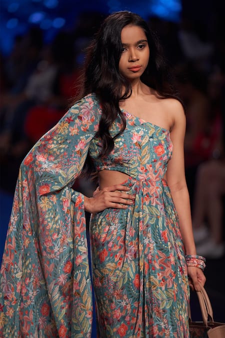 Blue Crepe Floral Print One Shoulder Gown