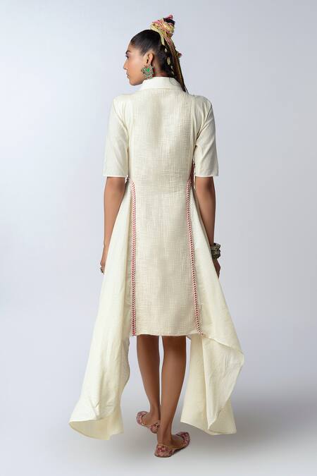Ivory dress with embroidered detail and asymmetric hem.