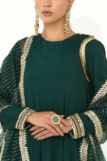 Bottle green anarkali featuring placed embroidery and a back keyhole. Paired with coordinating pant and striped dupatta.