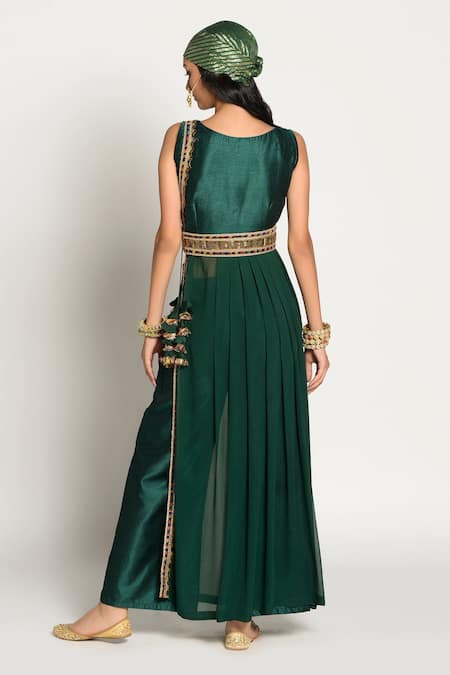 Bottle green sleeveless tunic with pleated panel & embroidered border. Paired with embroidered belt & embroidered hem pant.