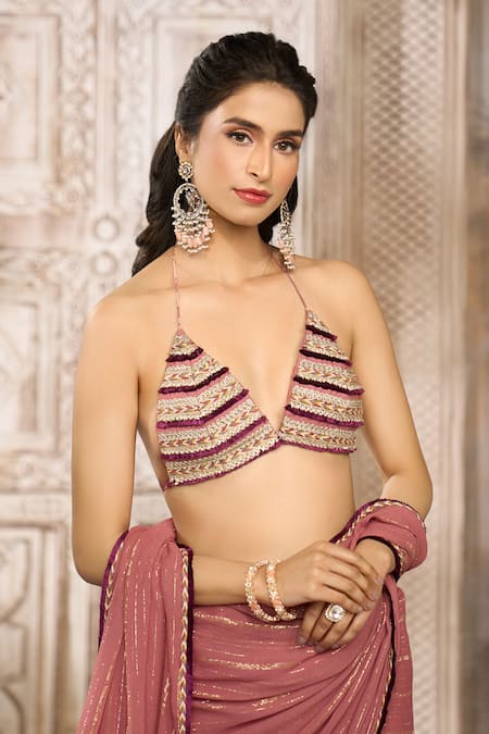 Pink saree featuring gold shimmer striped patterns and a braided, fringed border. Paired with an embroidered bustier style halter neck blouse with a back tie-up closure.