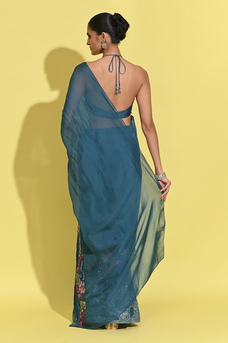 Buy_Rishi and Vibhuti_Blue Organza, Jacquard Embroidery Halter Floral Patchwork Pre-draped Saree Set_at_Aza_Fashions