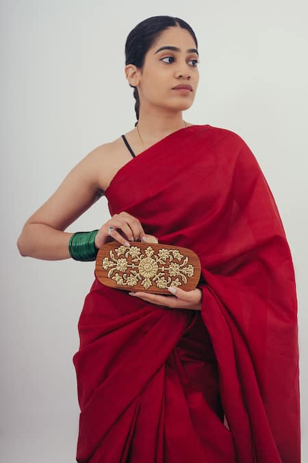 Brown oval clutch crafted in wood featuring 24K gold foil floral pattern