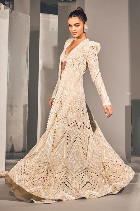 Ivory jacket featuring geometric patterned cutwork base delicately embellished with crystals and pearls. Paired with a matching embellished blouse and scallop patterned embroidered sharara.