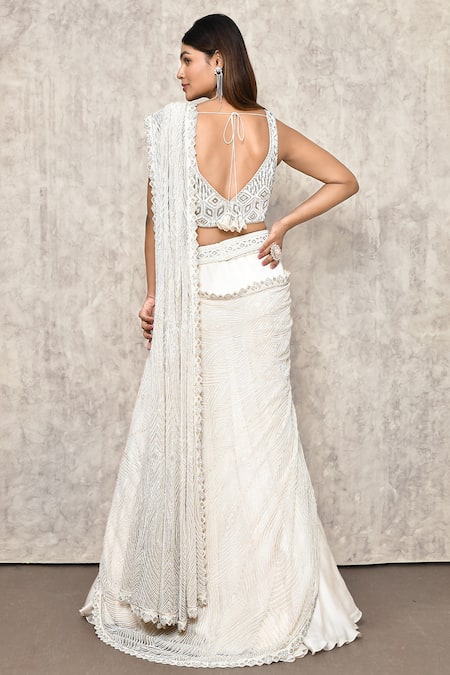 Ivory lehenga saree featuring intricate thread, cutdana, and bead embroidery. Accompanied by a geometric embroidered sleeveless blouse and a decorative belt.
