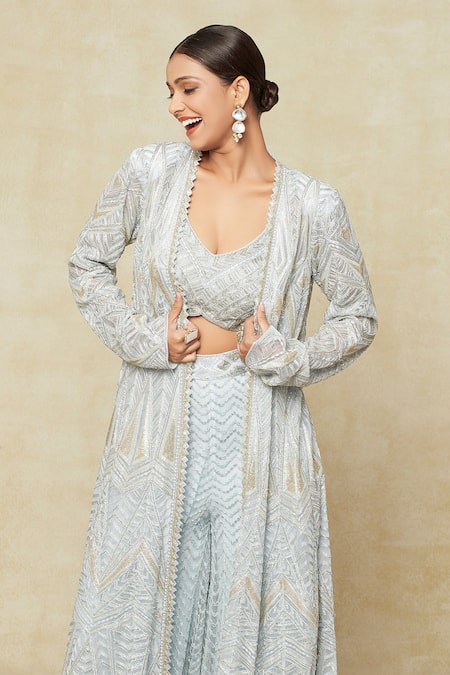 Light blue longline jacket featuring all-over geometric pattern embroidery. Paired with a matching embroidered blouse and chevron embroidered sharara.